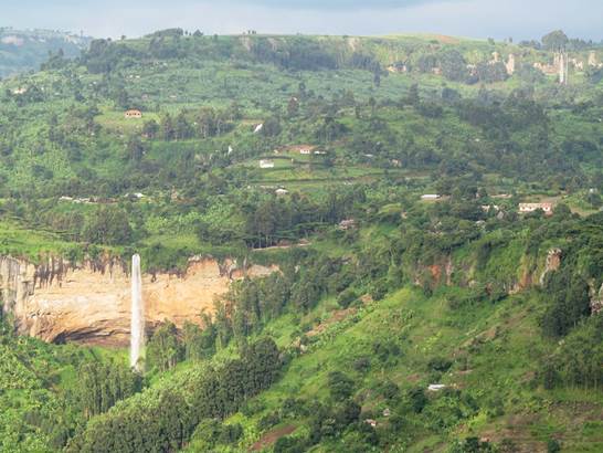 The highlight was Sipi Falls. There’s a huge sprawling extinct volcano on the Uganda-Kenya border called Mt. Elgon, which is mostly a national park. The crater rim is at about 4300m. The park fee is $90/day and you have to be guided. There are week-long treks. Sipi is just outside the park boundary, at about 1800m, overlooking the vast savannah with lakes on the horizon to the west that we could identify in Google Maps. It’s on the windward side of the mountain where moisture precipitates as the air gets pushed upwards by the terrain so the vegetation is lush. We had our usual accommodation discussion of quality vs price and settled toward the high end at $100 (with dinner and breakfast) to stay in the Sipi River Lodge (the night before in Mbale was $20), on a property that straddles the river (a creek in our terms) and a lush wildness of banana and coffee cultivation that includes the middle of three impressively tall waterfalls. We were told it drops 85m but it looked less to me.