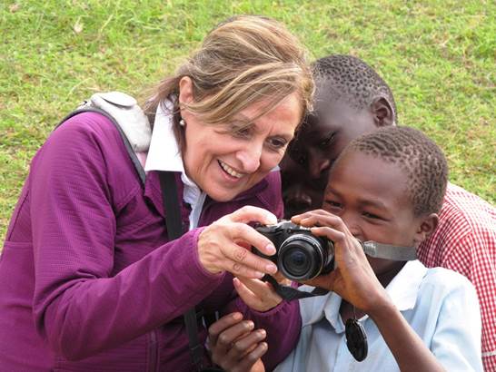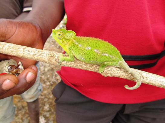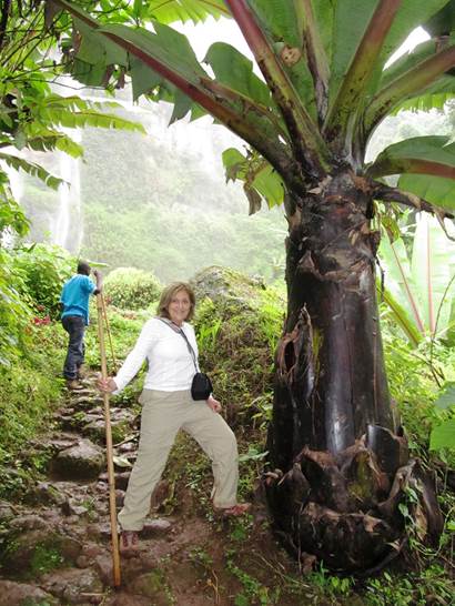 After lunch we headed up a path to the falls on our own. But not for long … a young man caught up with us. I tried to pay him to go away but he took that as a down payment for his guiding services and wouldn’t leave us. Peter. We went to bottom of the falls and then clambered up to the top where a bunch of little and not so little boys were watching cattle or hanging out. One of them had a baby iguana which we took a picture of, incurring more payment obligations. Unfortunately we hadn’t any small bills left; I had to throw a fit to keep Pepa from handing over a 10,000 shilling note ($4, and this is a $1/day country). She promised we’d give him something tomorrow.