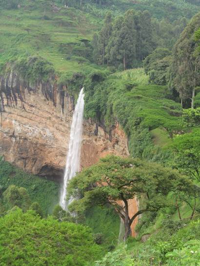 Patrick was interesting and explained lots of cultural stuff to us (local FGM practice, what questions are impolite (once on friendly terms, none, really), was there really a 105 year old woman living near the sunset place, how you grow coffee, … ). After seeing the upper falls, we drove to a place in a schoolyard overlooking the lowest, tallest (105m) falls which we had to approach from downwind of a very smelly overworked latrine. Patrick left us there to go to some Widows’ Association to get a bag of coffee for us.